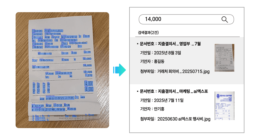 텍스트 추출 결과를 검색엔진과 유기적으로 연동하여, 이미지나 하드카피 문서에서도 원하는 정보를 빠르게 검색할 수 있습니다.