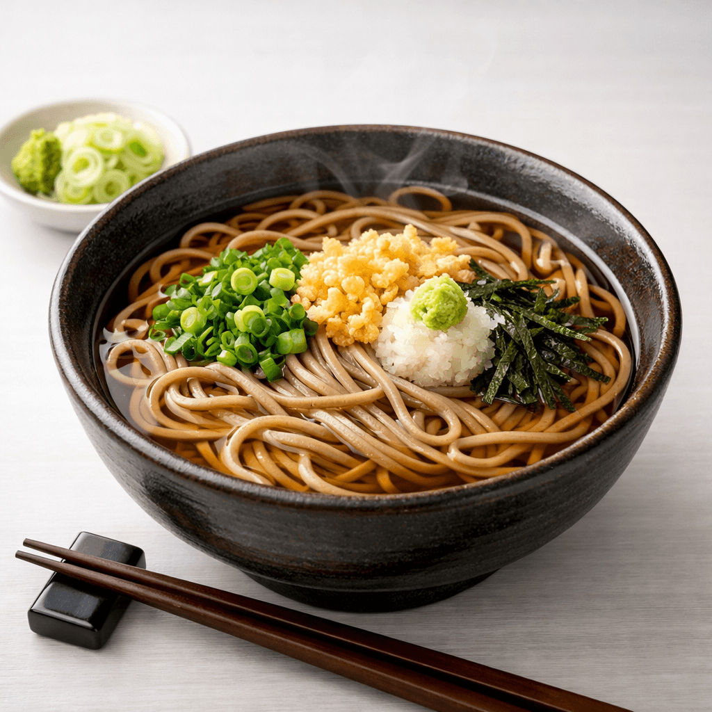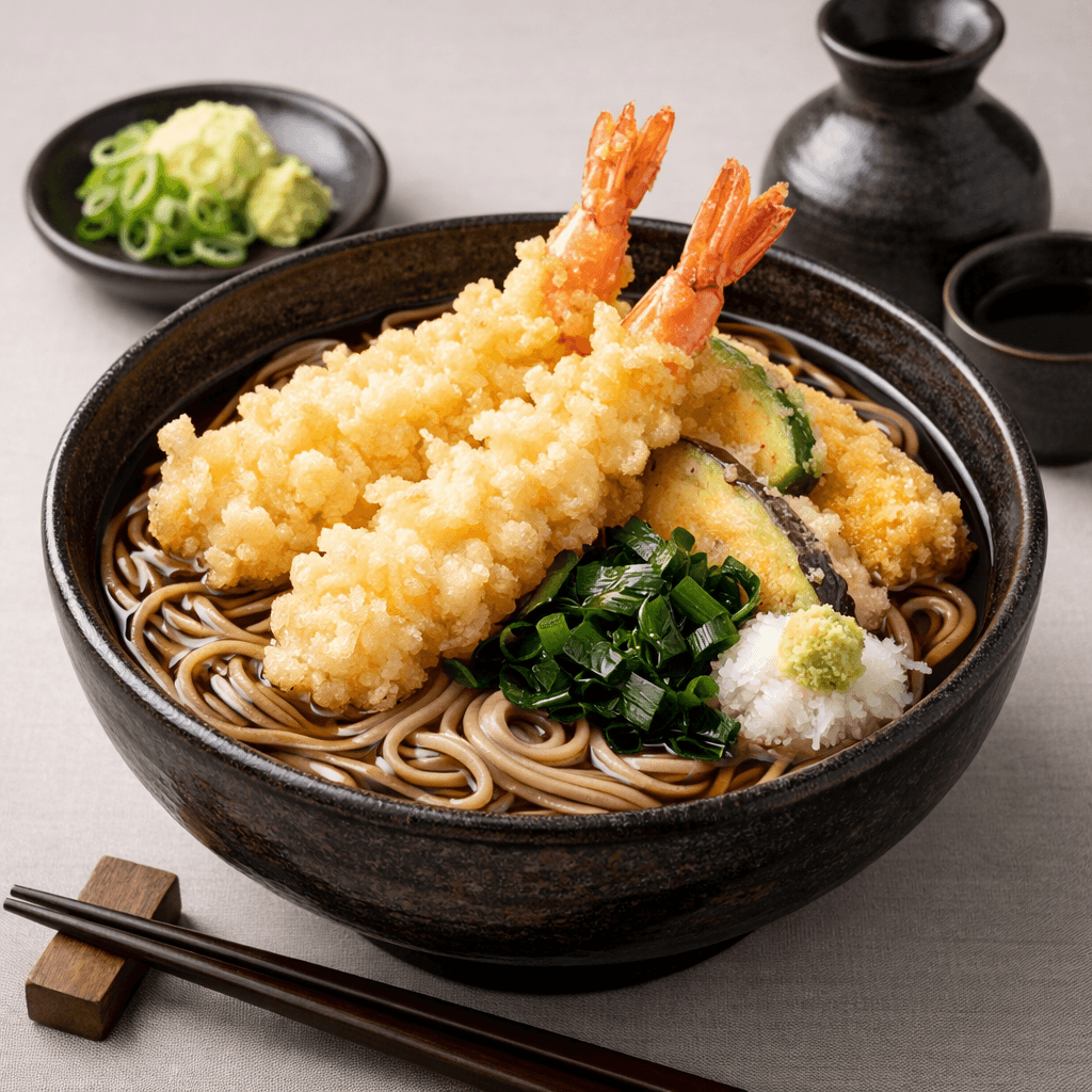 바삭하게 튀긴 새우나 야채 튀김을 곁들여 먹는 풍성한 맛의 메밀국수입니다.